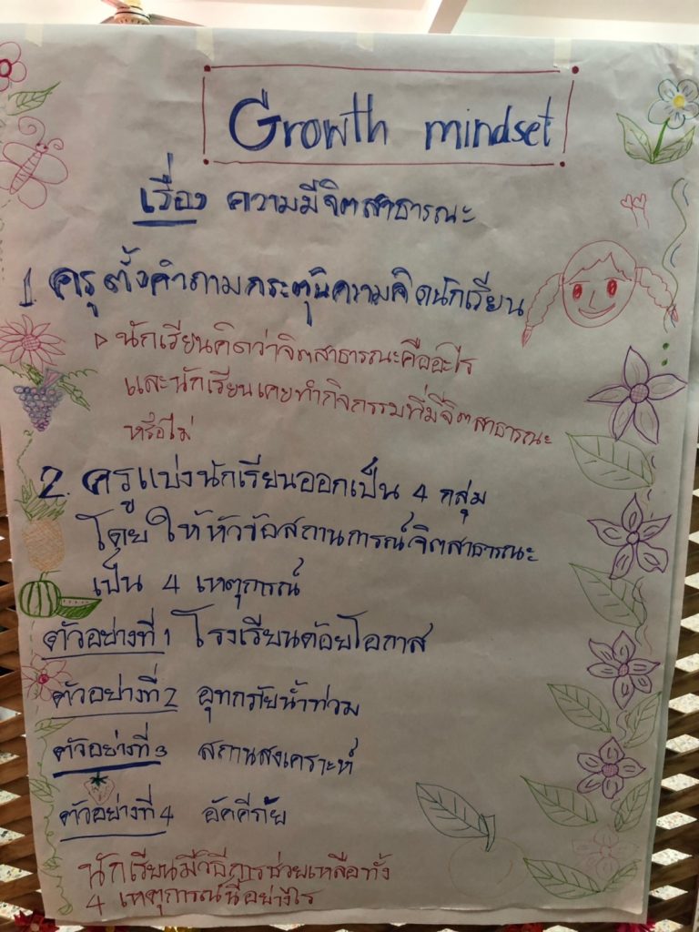 จากนั้นเป็นการเข้าสู่บทเรียนเกี่ยวกับพัฒนาการทางสมองของวัยรุ่น ซึ่งเกี่ยวข้องกับความสามารถและทักษะการรู้คิด (Cognitive ability), GRIT และ Growth Mindset โดยคุณครูได้ร่วมกันออกแบบกิจกรรมที่น่าสนใจมากมายภายในระยะเวลาอันสั้น ทำให้เห็นถึงความเป็นไปได้มากขึ้นในการนำเอาจิตวิทยาเชิงบวก เข้าไปสู่ห้องเรียนอย่างเป็นรูปธรรม